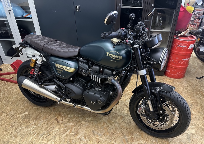 | Extras | 1. Hand, Unfall- und Sturzfrei. Extras: Individuelle Design-Lackierung in British racing green matt, Öhlins Dämpfer hinten, Kellermann Mini-Blinker, gesteppte Leder Sitzbank dunkelbraun, Lenkerspiegel uvm. |
